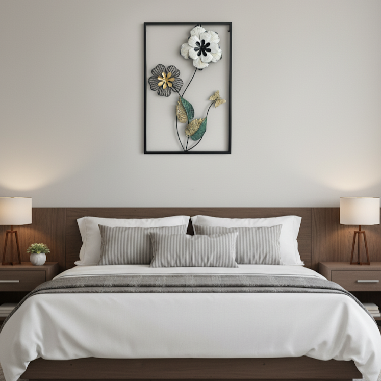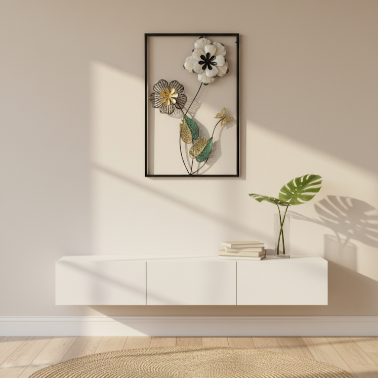 Apportez une touche poétique et élégante à vos murs avec ce tableau mural en métal au design floral en relief 3D. Deux grandes fleurs, travaillées en blanc et noir, s’associent à des feuilles finement sculptées et à un papillon doré délicat. L’ensemble crée un effet visuel réaliste et raffiné qui capte la lumière et attire immédiatement le regard.